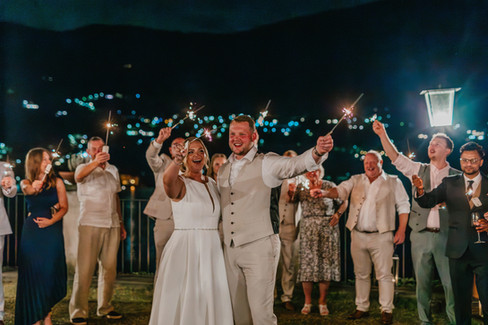 As the day rolled into evening, we were treated to a spectacular sunset over the lake that bathed the couple in a golden glow. The celebration flowed effortlessly into lively dancing, with guests filling the floor and enjoying every minute of the party. Later, the couple headed outside to cut their cake beneath the warm evening air, before the night ended in style with a magical tunnel of sparklers lighting their way.