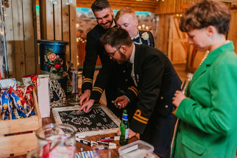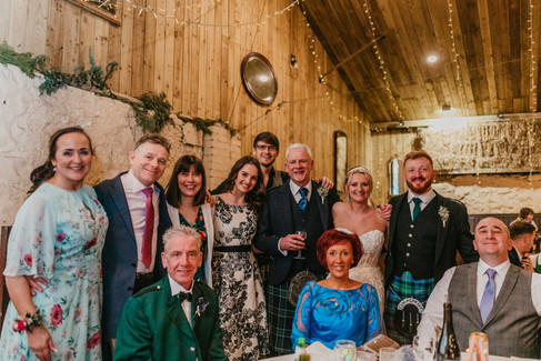 Kendal and Ben then returned to the barn to join their guests for speeches before dinner. These were very funny and all the decoration and strings of fairy lights added to the great atmosphere. They then enjoyed what's becoming a popular trend of doing a 'table photo dash', racing to each table to get a photo with the group sat there before the buffet opened!